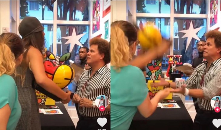 Para se vingar do pintor, a dona do restaurante, em um momento de fúria, entrou no ateliê onde Britto expõe suas obras nos Estados Unidos e fez questão de comprar uma das obras mais caras do local. Na gravação, ela diz: “Eu exijo que você nunca vá ao meu restaurante e ofenda minha equipe. Eu te respeitava como artista”. Em seguida, joga a peça no chão, para surpresa de Britto e todos os presentes. Romero até tentou segurar o objeto com a mão, mas não adiantou.